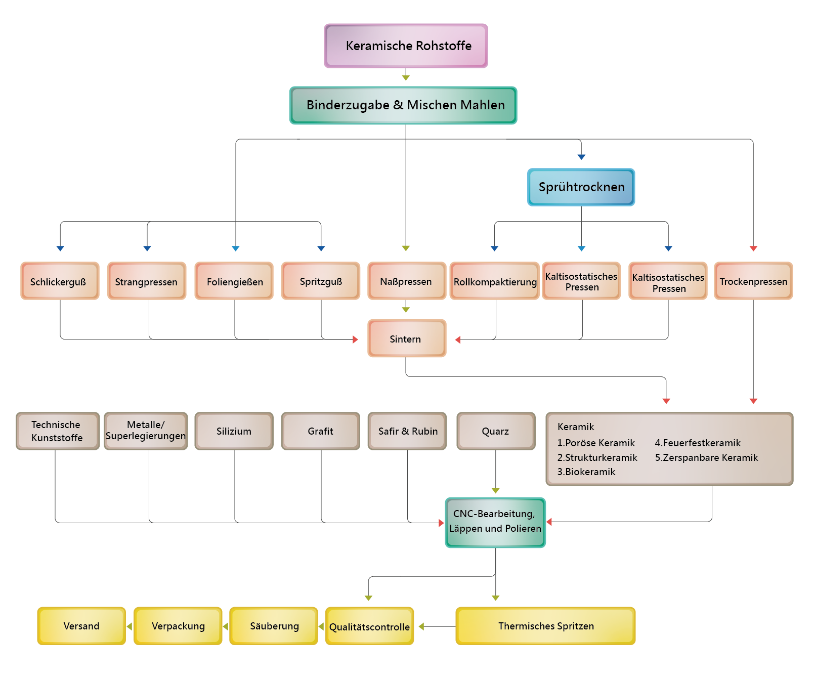 Keramik wird normalerweise durch Pulververdichtung, gefolgt von Sintern und maschineller Bearbeitung verarbeitet. Das Ergebnis ist ein Keramikkörper mit gewünschten Abmessungen und Eigenschaften.